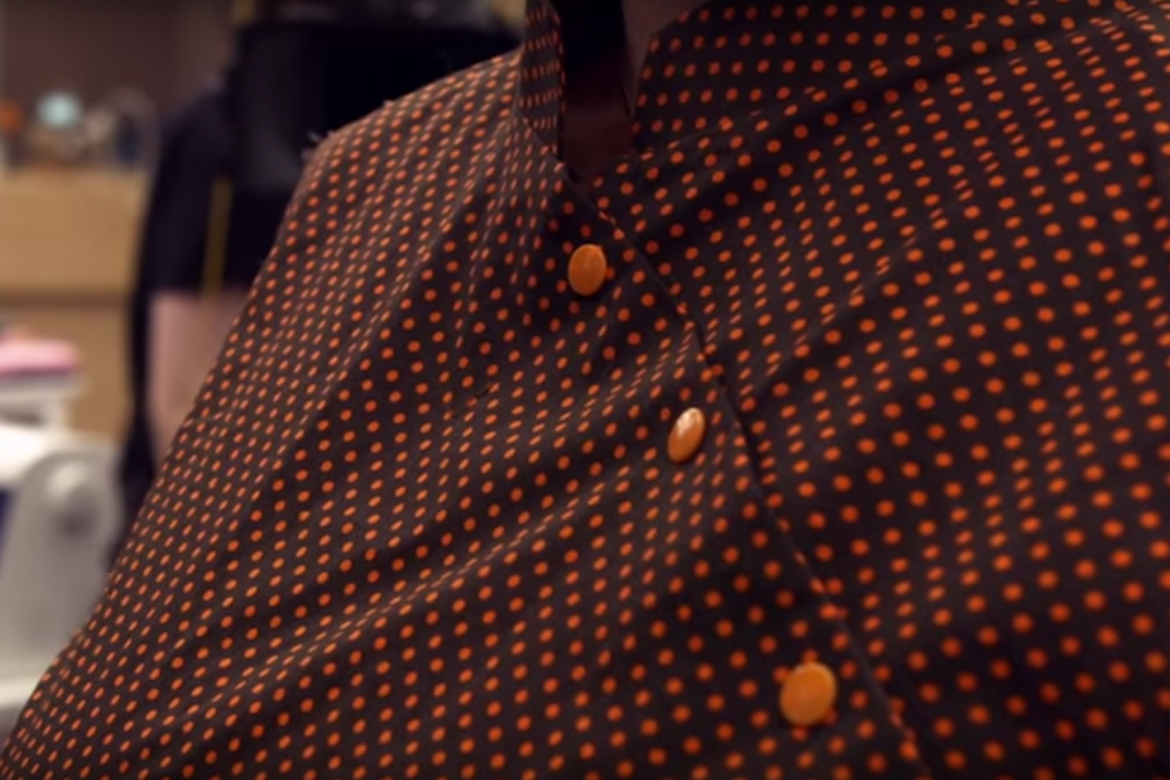 Die Passformkontrolle hat Utas braune Tupfenbluse bereits hinter sich.