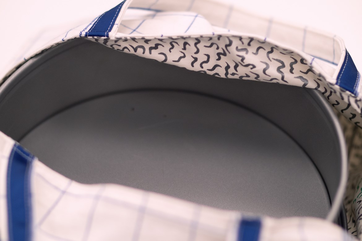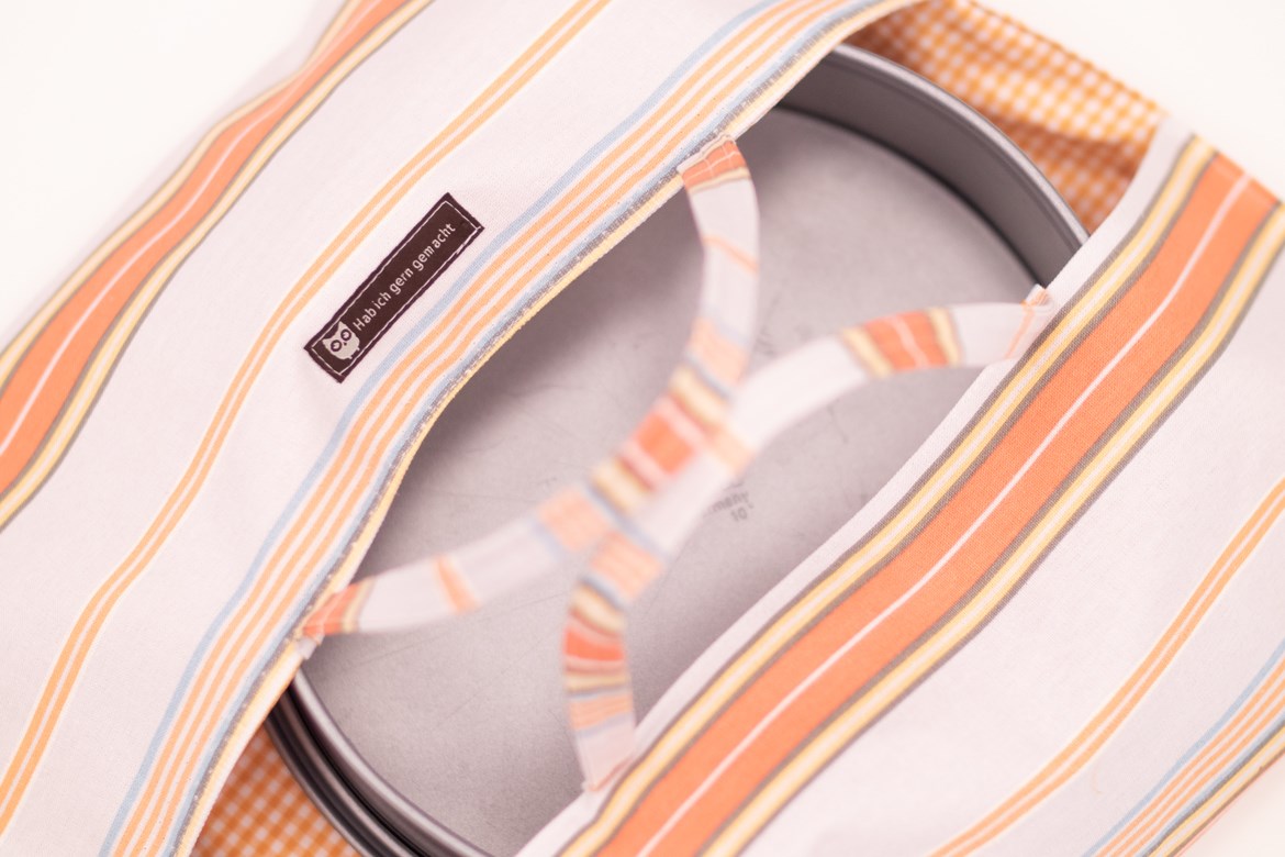 Die Idee zur Kuchentasche habe ich im Netz bei waseigenes.com gefunden und habe sie sofort aufgegriffen. Da mir das Auftrennen der Geschirrtücher zu aufwendig ist, benutzen wir Meterware von Hilco bei oh NÄH! Wer so wie ich keine Lust zum Messen hat, kann auch ein DIN A3 Blatt als Vorlage nehmen (die lange Seite ist 42 cm lang). Bei einer Stoffbreite von 1,40 m schneidet ihr bis zum Stoffbruch und der Zuschnitt ist fertig. Das macht ihr für den Innen- und Oberstoff. Für die Henkel benötigt ihr einen Stoffstreifen von 6 cm Breite und 70 cm Länge. Die Nahtzugaben der Henkel werden eingebügelt und zusammengenäht, je nach Geschmack können die Henkel und der Oberstoff noch verziert werden. Die fertigen Henkel an die kurze Seite des Außenstoffes nähen mit einem Abstand von ca. 8 cm von der Seitenmitte – dabei darauf achten, dass die Henkel auf dem Stoff liegen und nach innen zeigen. Jetzt die beiden Stoffstücke rechts auf rechts zusammennähen und eine 8 cm breite Wendeöffnung an einer langen Seite offen lassen. Die Tasche wenden und die Kanten bügeln. Die kurzen Seiten knappkantig steppen und dabei die Henkel nach außen legen. Die kurzen Seiten 15 cm zur Mitte hin einschlagen und die Kanten knappkantig absteppen. Dabei wird die Wendeöffnung auch mit zugenäht. Jetzt fehlt nur noch der Kuchen. 😉