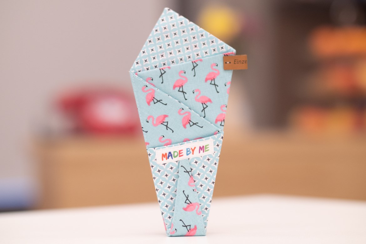 Gleicher Zuschnitt mit DIN A4 Blatt als Schnittmuster. Hierbei werden alle Kanten schmal mit Einschlag/Umschlag genäht.